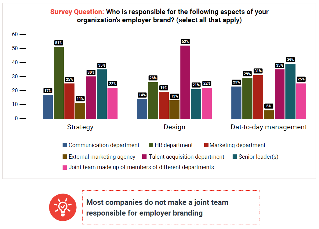 We found that senior leaders (51%) are most likely to be responsible for strategy, the marketing department (52%) is most likely to be responsible for design, and HR (39%) is most likely to be responsible for the day-to-day management. In truth, though, the picture is much more complex in that participants often chose more than one department as being responsible for all three of these areas, and many also chose joint teams.