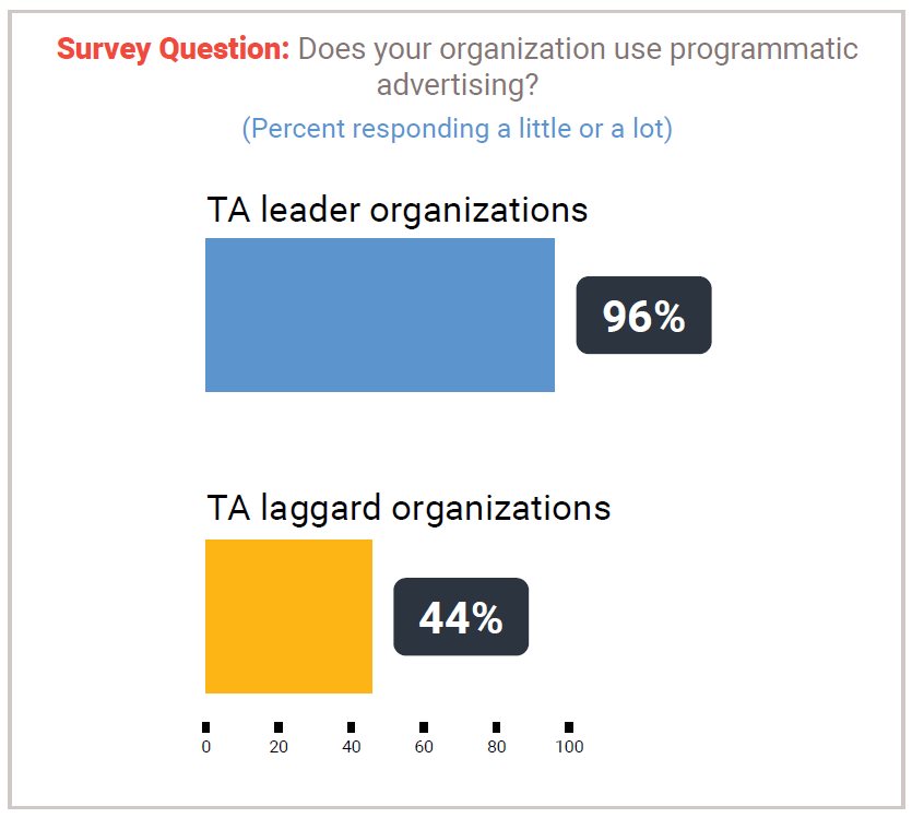 As we explained previously, programmatic advertising uses advanced technologies to target ads to the most likely candidates and charges the organization only when a candidate clicks on the display. Ninety-six percent of TA leader organizations use programmatic advertising either a little or a lot, compared to only 44% of TA laggards.