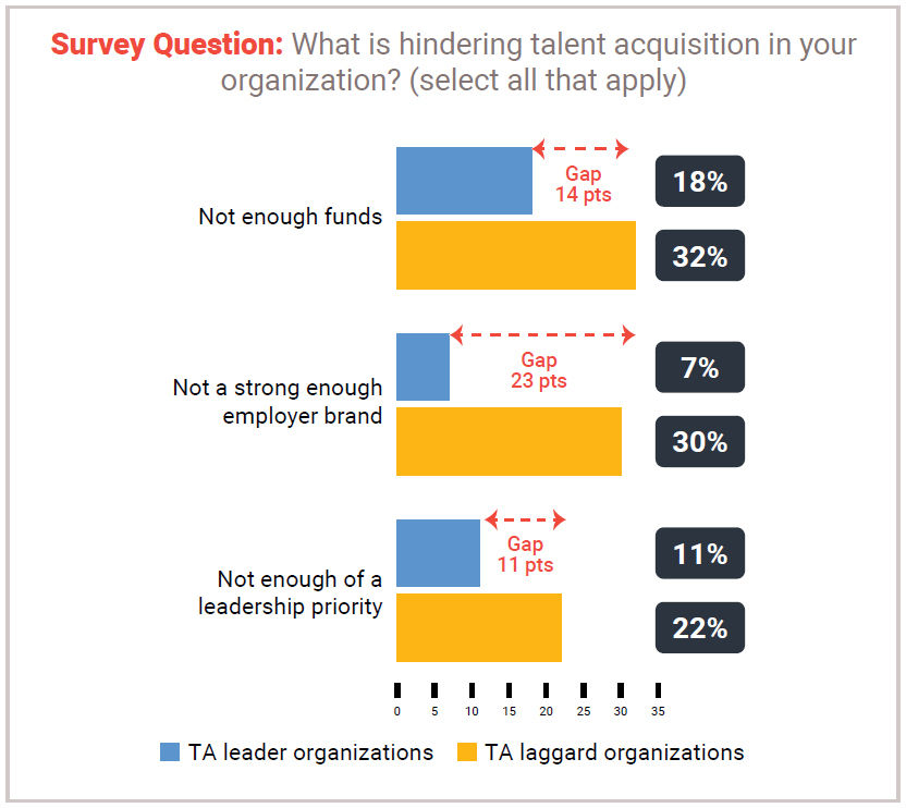 These hindrances tend to be linked to corporate culture. For TA laggard organizations to address these hindrances, their leaders must prioritize TA enough to invest in the employer brand in particular and talent acquisition more generally.