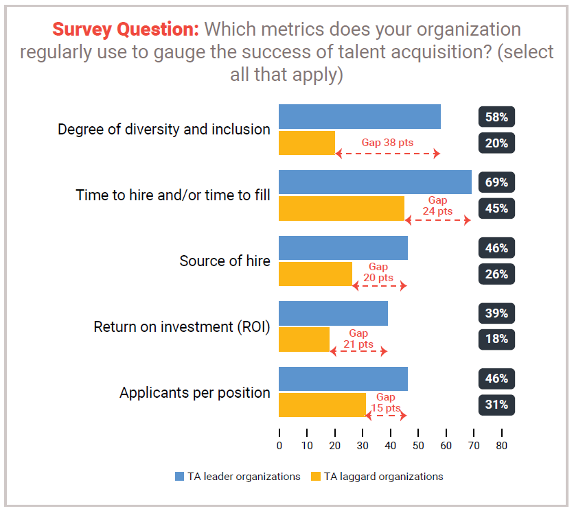 As we noted earlier, diversity and inclusion in the workforce has become a much higher priority for organizations over the last year. It is telling that TA leader organizations are nearly three times more likely to measure it, suggesting this has become an imperative for many high-talent organizations.