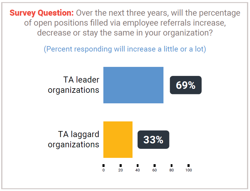 As we discussed previously, internal referrals are a low cost and reliable way to find talent for internal openings. Sixty-nine percent of TA leader organizations plan to fill more open positions with internal referrals over the next three years. Yet, only 33% of TA laggard organizations expect to see an increase.