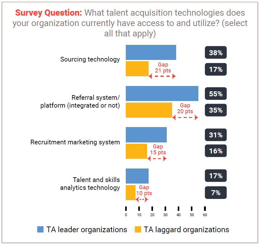 We asked participants to indicate which recruiting technologies their organization has access to and utilizes. More than two-fifths of TA leader organizations indicate they use five out of the twelve technologies. Leaders appear to be more comfortable with talent acquisition technologies than their TA laggard peers. Some of the largest differences between TA leader and laggard organizations are in the areas of: