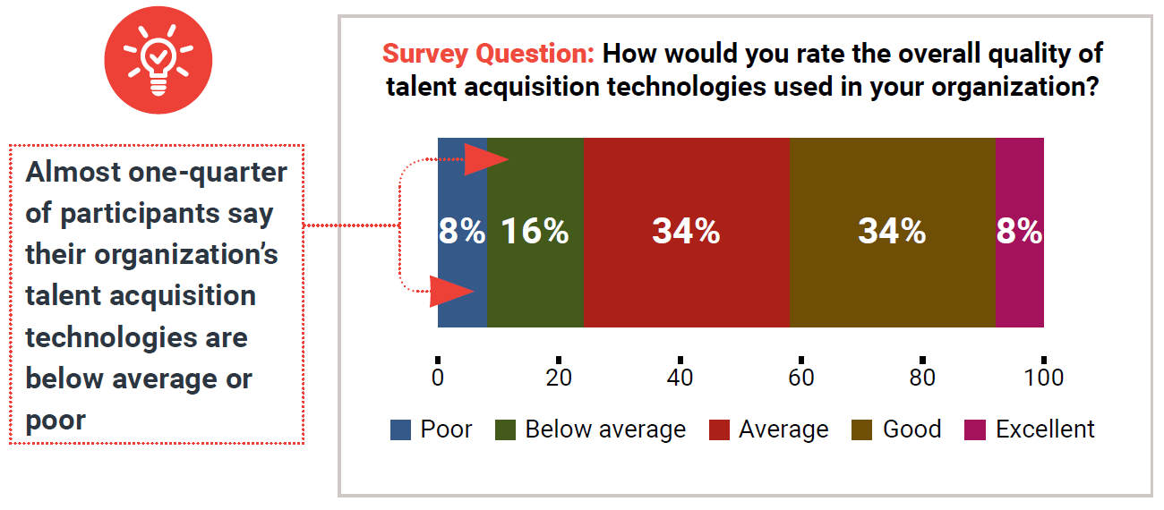 Given the amount of attention talent acquisition technologies have received in the past decade, one might hope that by now most companies would feel positively about their systems. Unfortunately, that’s not the case. Only 42% of respondents describe their talent acquisition technologies as good or excellent.