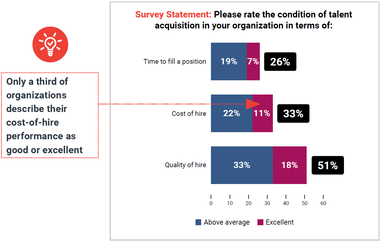 Only about half of organizations report that the quality of their hires is above average or excellent. The news is even grimmer in other areas. Only a third say their ability to control cost of hires is above average or excellent, and a mere 26% give their organizations high marks in the area of time to fill a position.