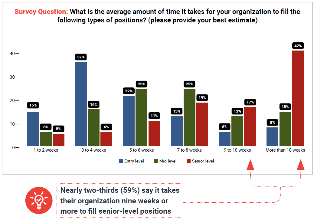 Entry-level roles can typically be filled in less than four weeks (52%), whereas senior-level roles typically take more than nine weeks to fill (59%).