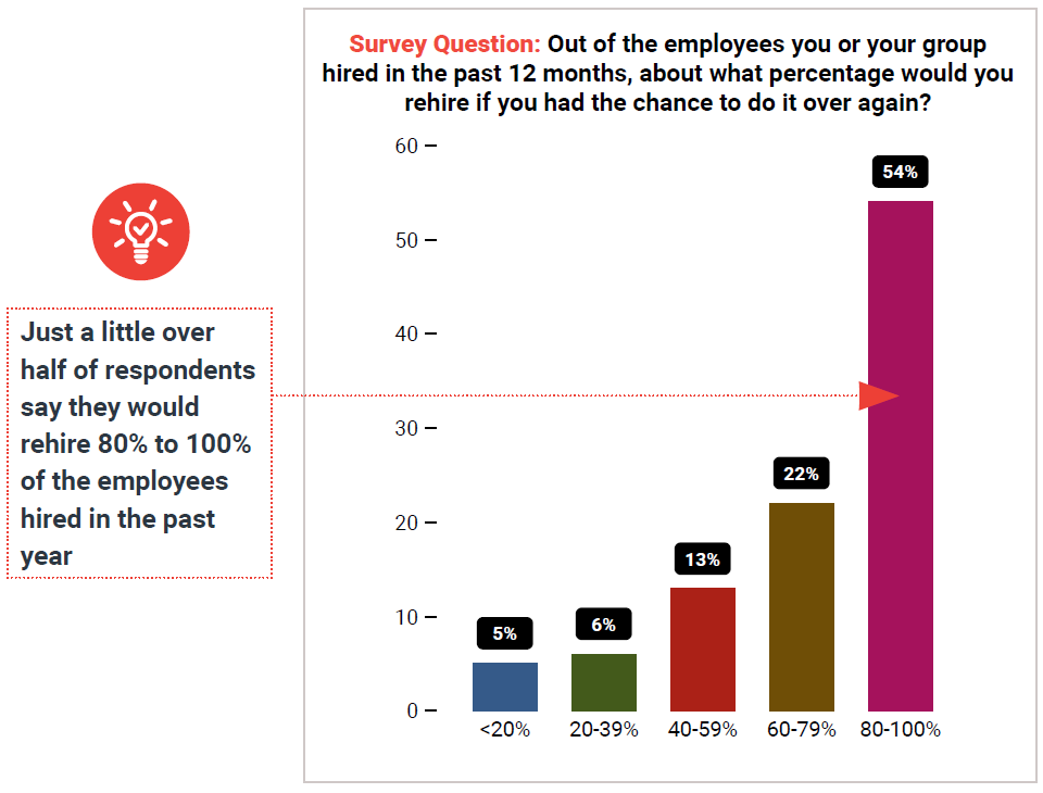 Just over one-fifth (22%) say 60% to 79% of new employees are worthy of being rehired (in other words, 21% to 40% of new hires were regrettable hires). Worryingly, 24% say they would rehire fewer than 60% of the employees hired in the past year.