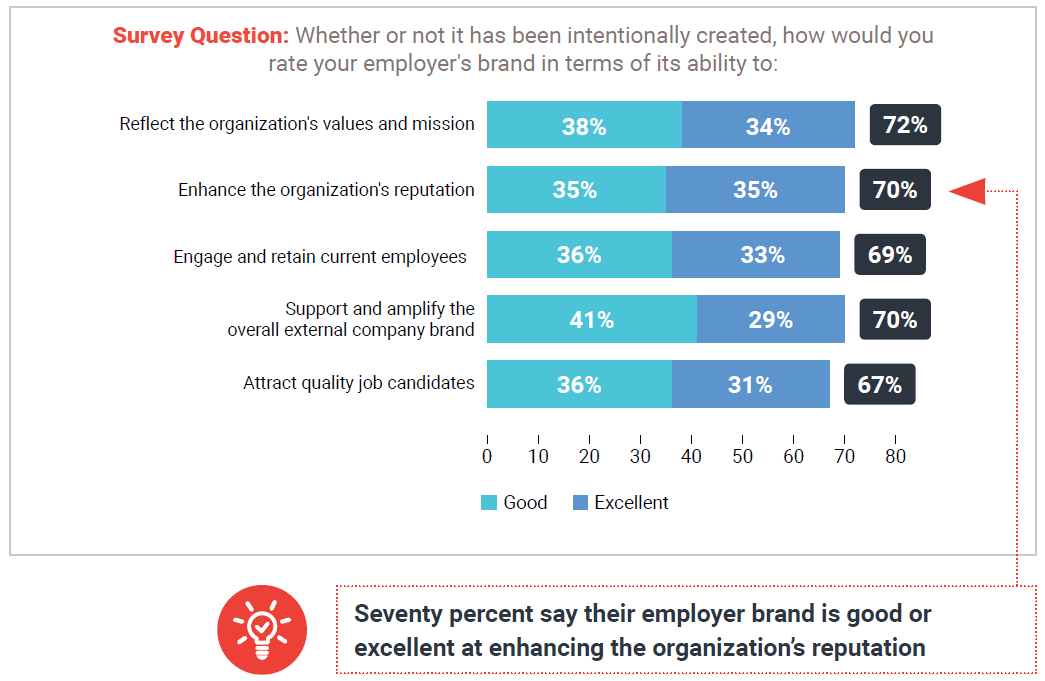 Among the external purposes is burnishing the organization’s reputation. Fully 70% say their employer brands are either good or excellent at enhancing reputation.