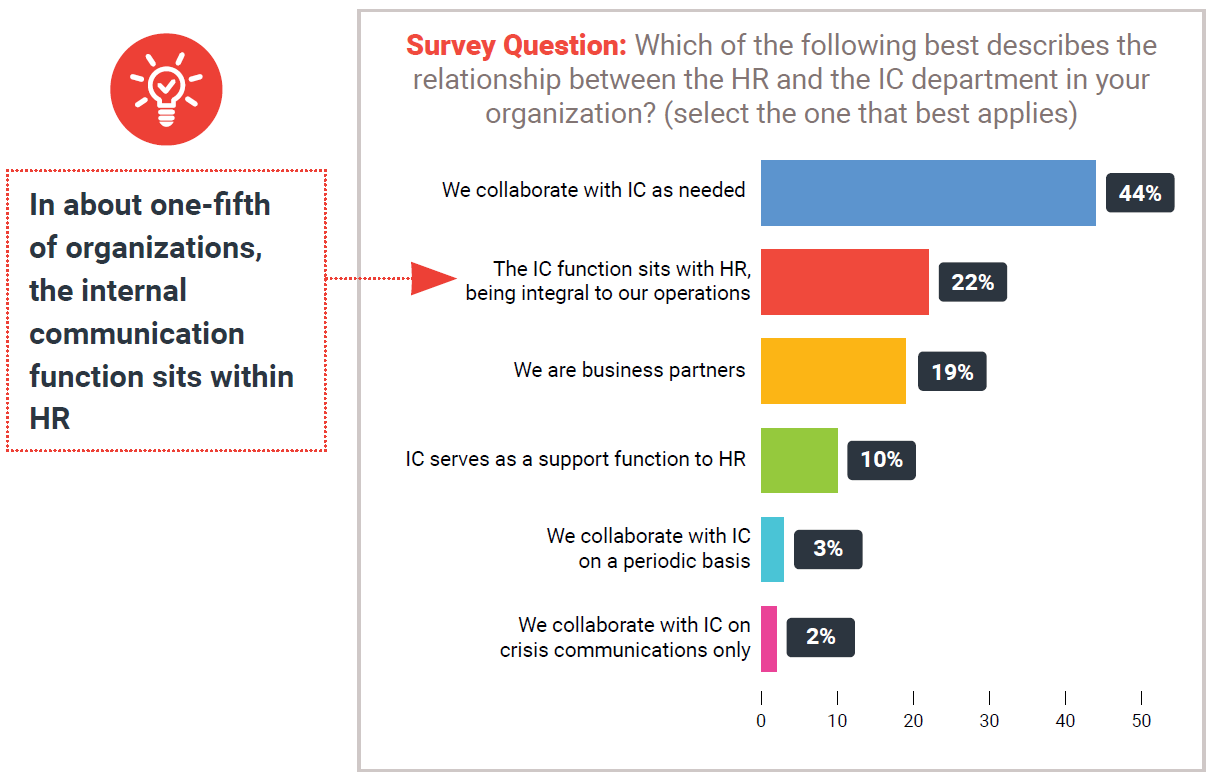 In some cases, IC sits within HR (22%) or is a support function for HR (10%). More commonly, IC is an independent department that HR collaborates with as needed (44%) and, in some cases, the relationship is described as being business partners (19%). The bottom line is that the two departments are often closely connected.