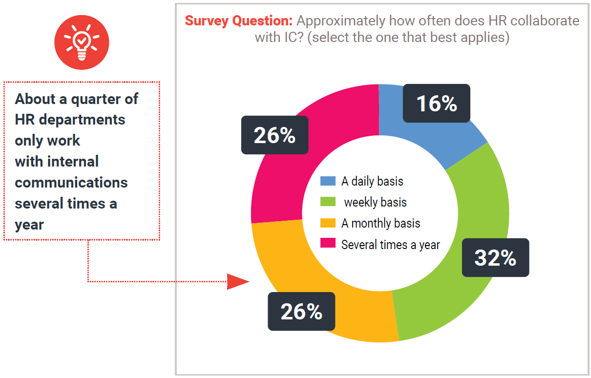 Generally speaking though, about three-quarters say HR collaborates with IC at least monthly and often more often. HR departments that collaborate with internal communication only several times a year may do well to consider why other HR departments find it helpful to collaborate much more regularly.