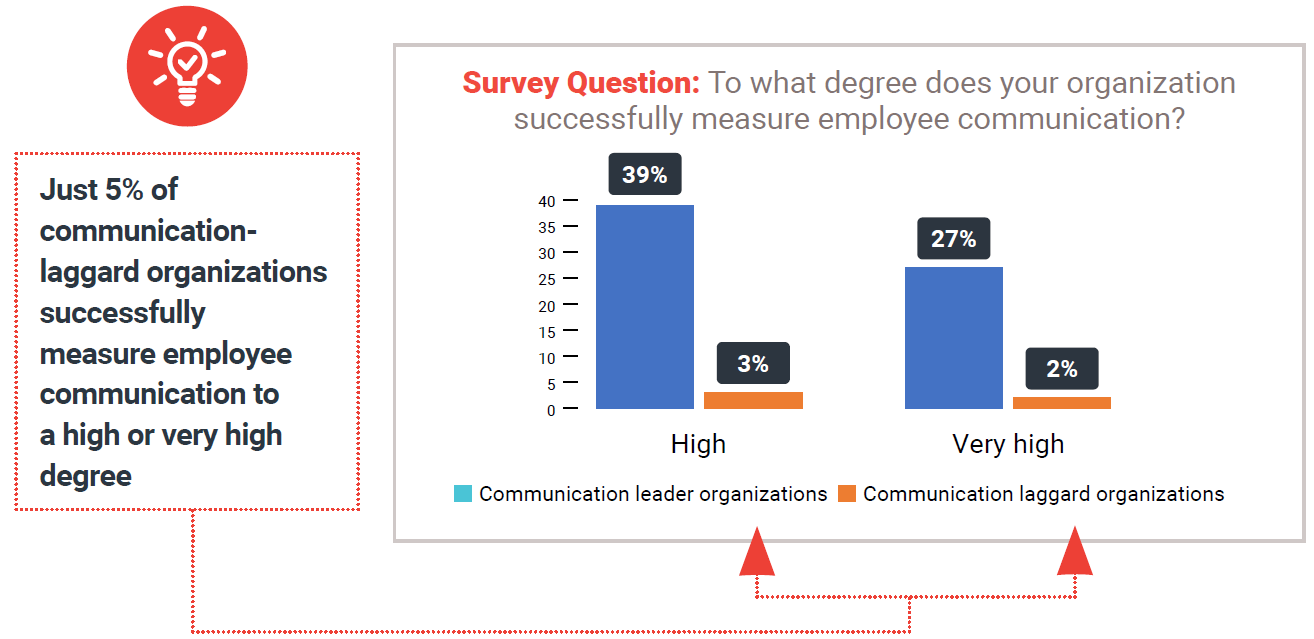 It’s striking to consider the difference between communication-leader organizations and communication-laggard organizations when you look at measurement. Among communications leader organizations 66% rate high or very high in successfully measuring communication; among communication-laggard organizations, it is a paltry 5%.