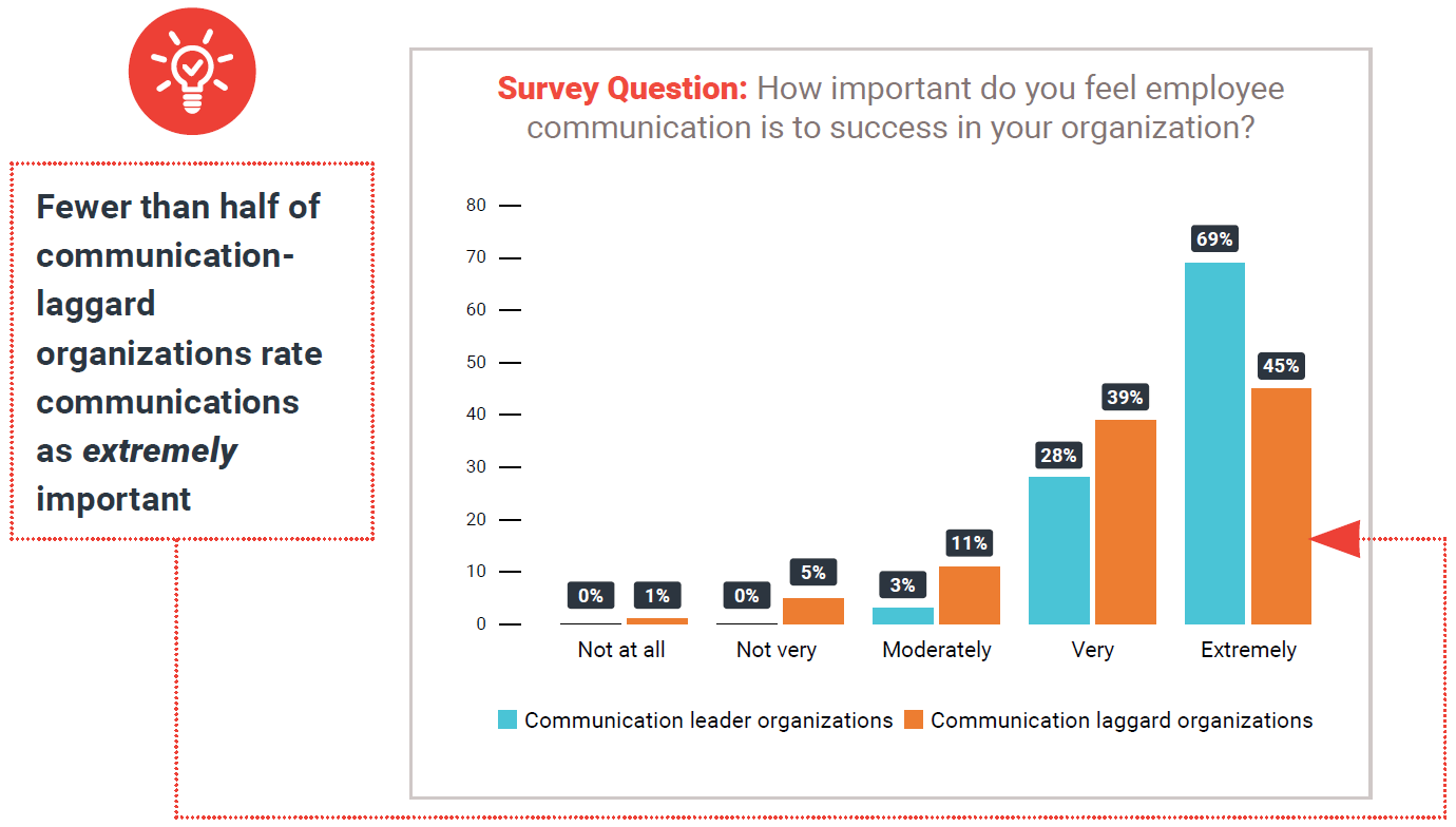 Almost 70% of communication-leader organizations go so far as to say communication is extremely important compared with 45% of laggards.