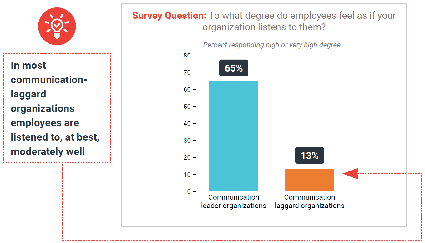 Communication-leader organizations are five times as likely as communication-laggard organizations to have employees who feel the company listens to them to a high or very high extent (65% vs. 13%)