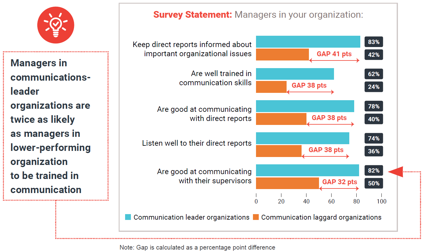 Managers in communication-leader organizations are much more likely to be good at all aspects of communication than their brethren in lower-performing organizations. The biggest gap is in keeping direct reports informed about important organizational issues, where communication-leader organizations are almost twice as likely to do so than communication-laggard organizations.