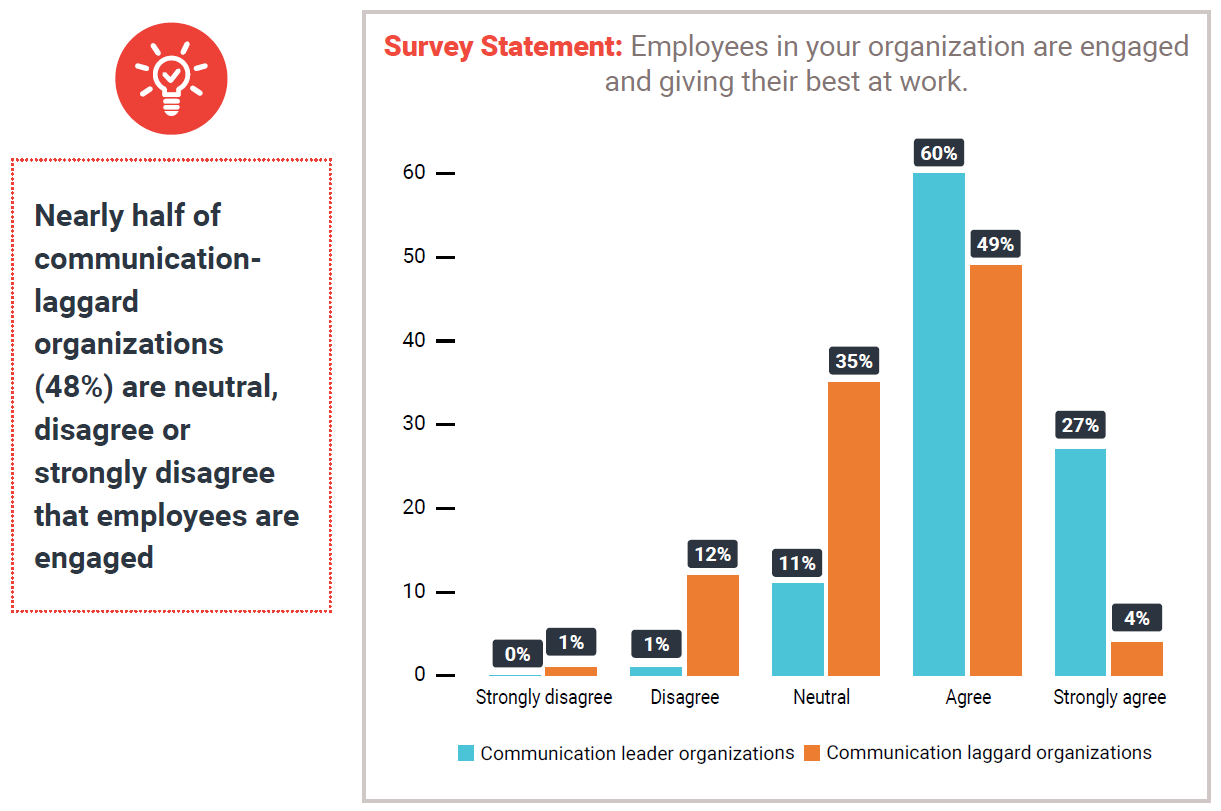 Communication-leader organizations report much higher employee engagement levels than communication-laggard organizations. Only 4% of communication-laggard organizations strongly agree employees are engaged, compared to 27% of communication-leader organizations. On the other end of the scale, almost half of communication-laggard organizations (48%) are neutral, disagree or strongly disagree that employees are engaged; only 12% of communication-leader organizations score this poorly on engagement.