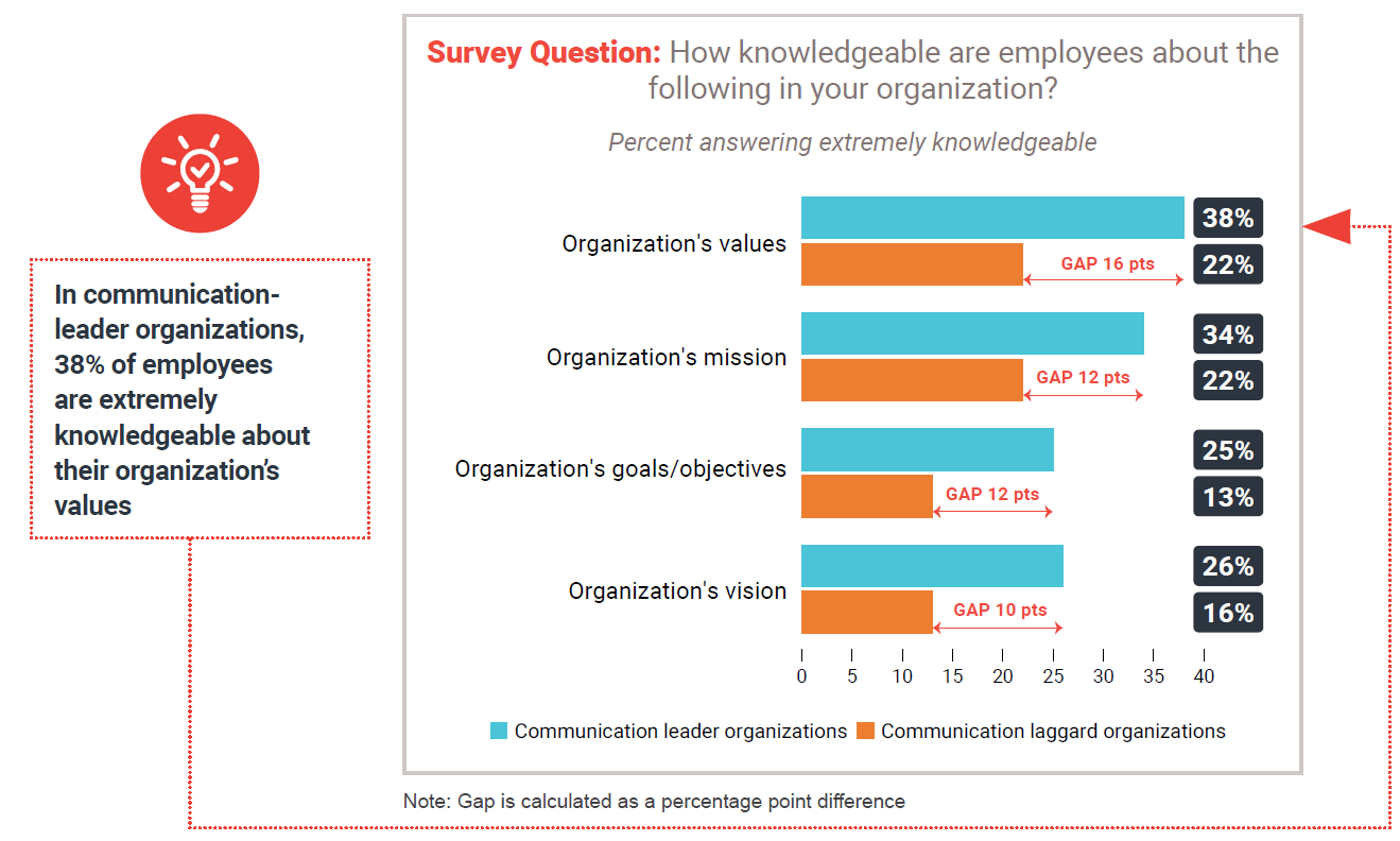 Employees in communicationlaggard organizations are less likely to know the organization’s values, mission, objectives, and vision