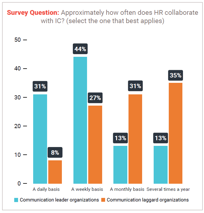 HR departments in communicationleader organizations are far more likely than communication-laggard organizations to collaborate with IC on a daily basis (31% vs. 8%)