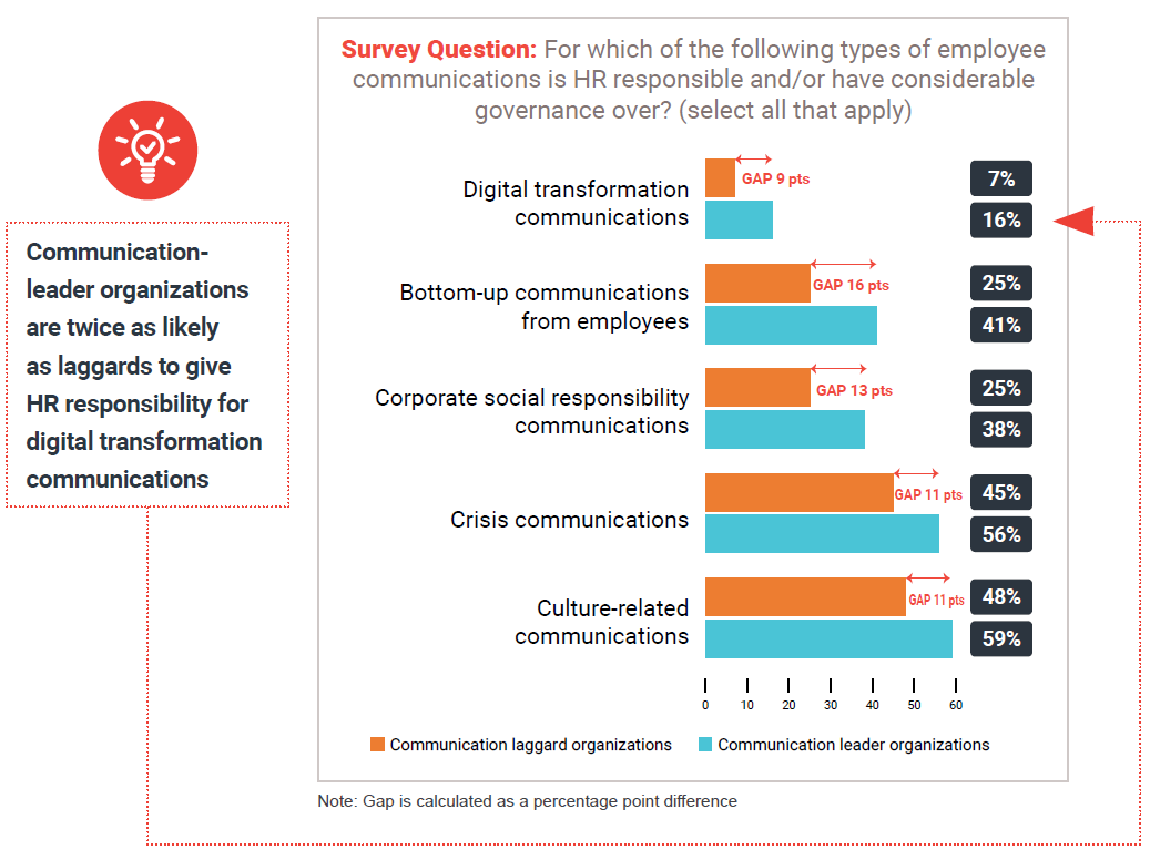Communication-leader organizations are more likely to give HR responsibility for various types of employee communication
